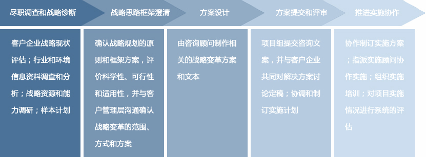 依托丰富的行业资料积累、细致的尽职调查以及与客户高层的充分沟通与交流,整理出了一套梳理、充实、显化、细化公司战略的工具和方法,并建立与 之配合的战略执行和评价机制,期望导入真正符合企业发展战略的人力资源系统。